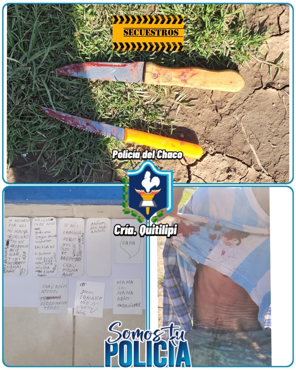 Minutos después, los móviles lograron ubicarlo en una zona boscosa cercana a la Ruta 4 y la Ruta Nacional 16. Cuando los agentes intentaron dialogar con él, el hombre visiblemente alterado sacó dos cuchillos y comenzó a autolesionarse en los brazos y el abdomen. En ese momento, el personal actuó con rapidez para resguardar su vida, logrando reducirlo y retirarle las armas blancas.