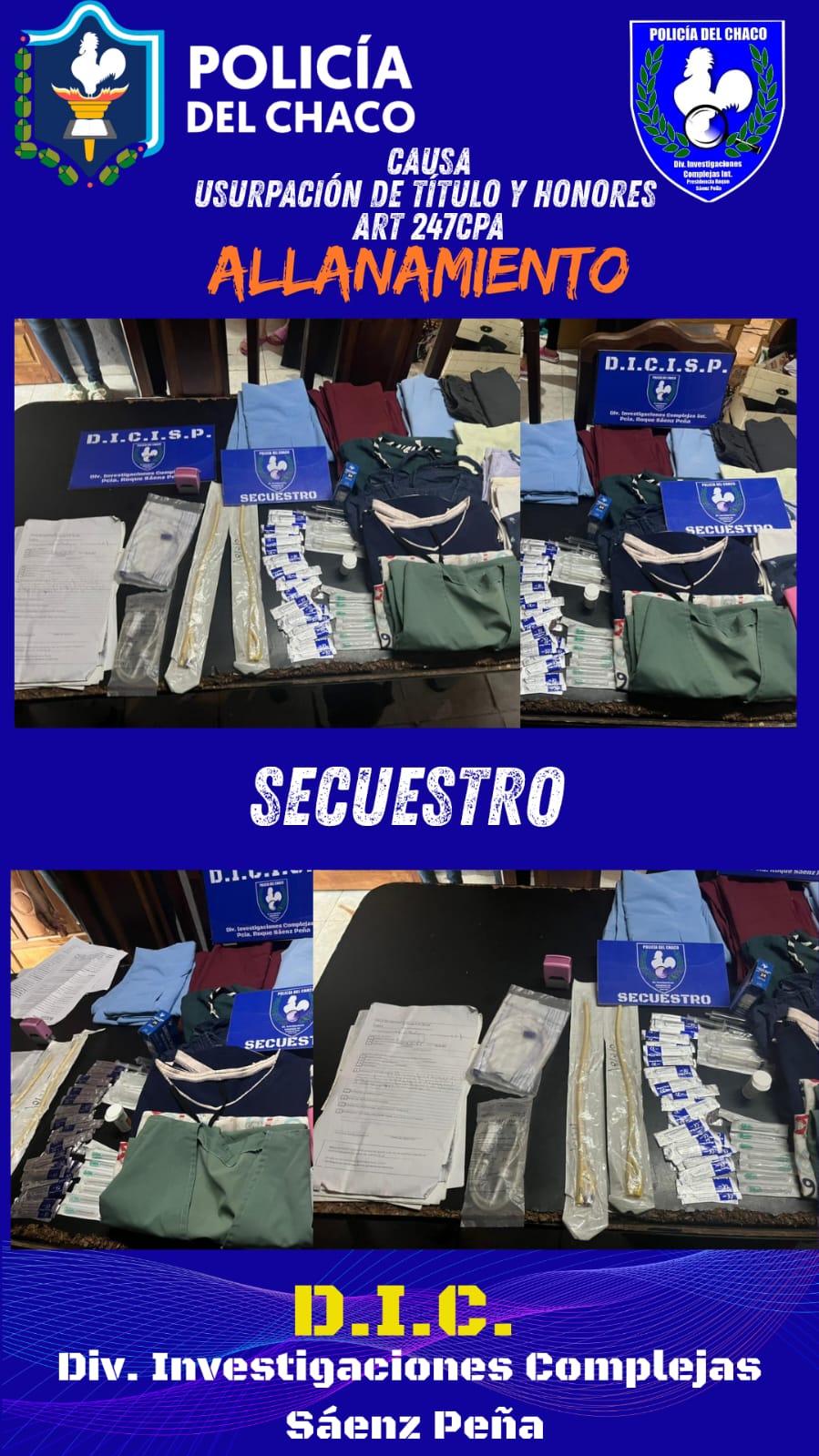 Personal de la División Investigaciones Complejas del Interior de Sáenz Peña realizó este viernes un allanamiento en una vivienda del barrio San Cayetano de Quitilipi, en el marco de una causa por “Supuesta Usurpación de Título y Honores”, prevista en el artículo 247° del Código Penal Argentino.