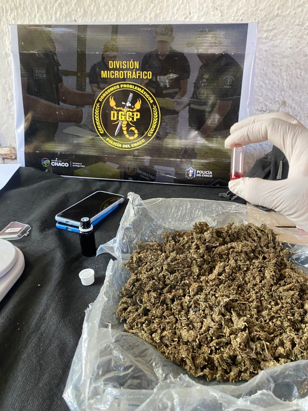 Durante el procedimiento encontraron 336 gramos de marihuana, distribuidos en una bolsa tipo ziploc y en varios envoltorios listos para la venta. También secuestraron una balanza digital, recortes de polietileno, un teléfono IPhone 11 Pro Max y $34.100 en efectivo.