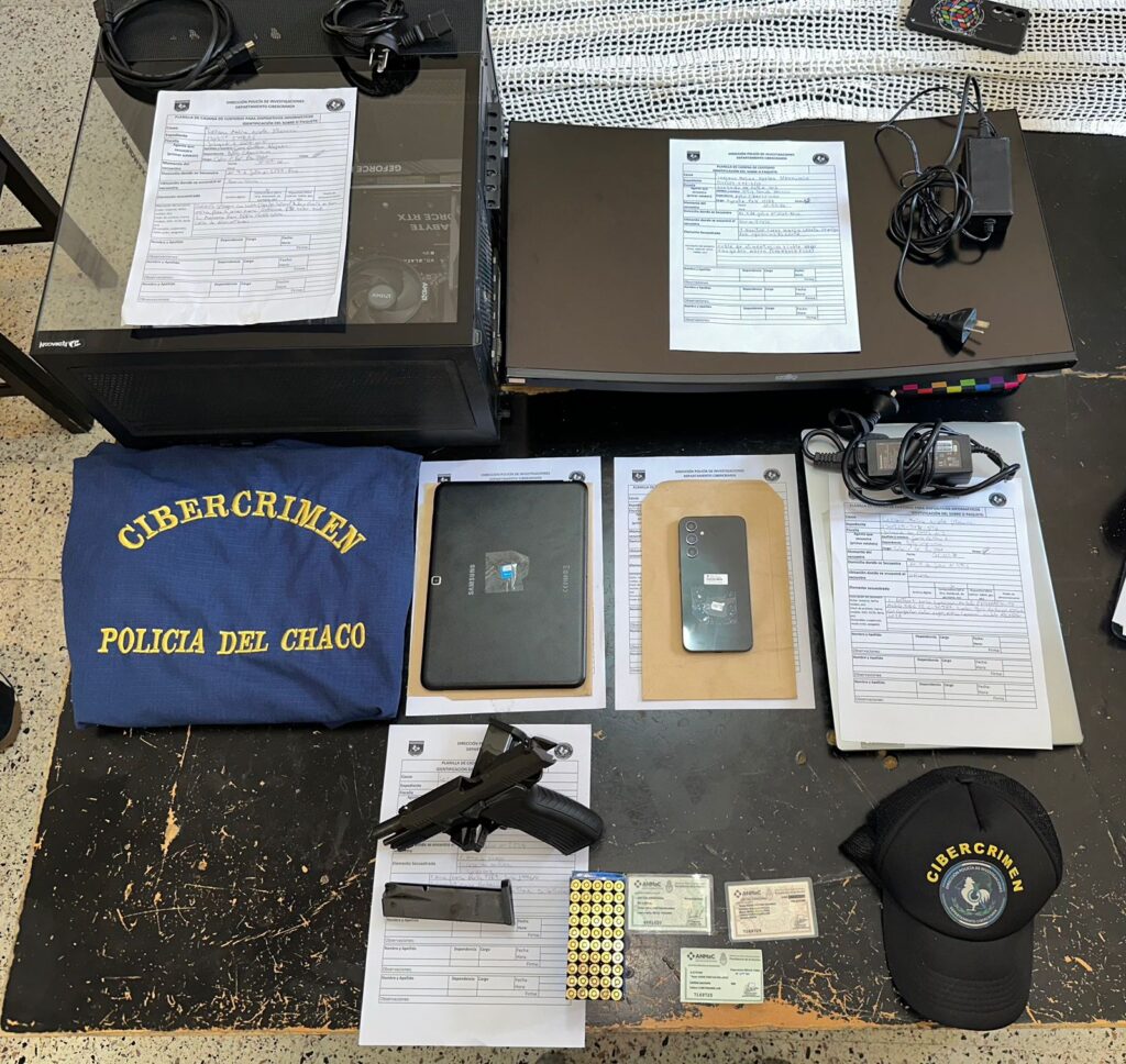 Como resultado de los operativos, los agentes secuestraron varios dispositivos electrónicos considerados de interés para la causa, entre ellos teléfonos celulares, notebooks, una tablet, equipos informáticos de escritorio y soportes de almacenamiento digital. Asimismo, en uno de los domicilios procedieron al secuestro de un arma de fuego tipo pistola calibre 9 milímetros, con cargadores y municiones, además de documentación vinculada a su tenencia.