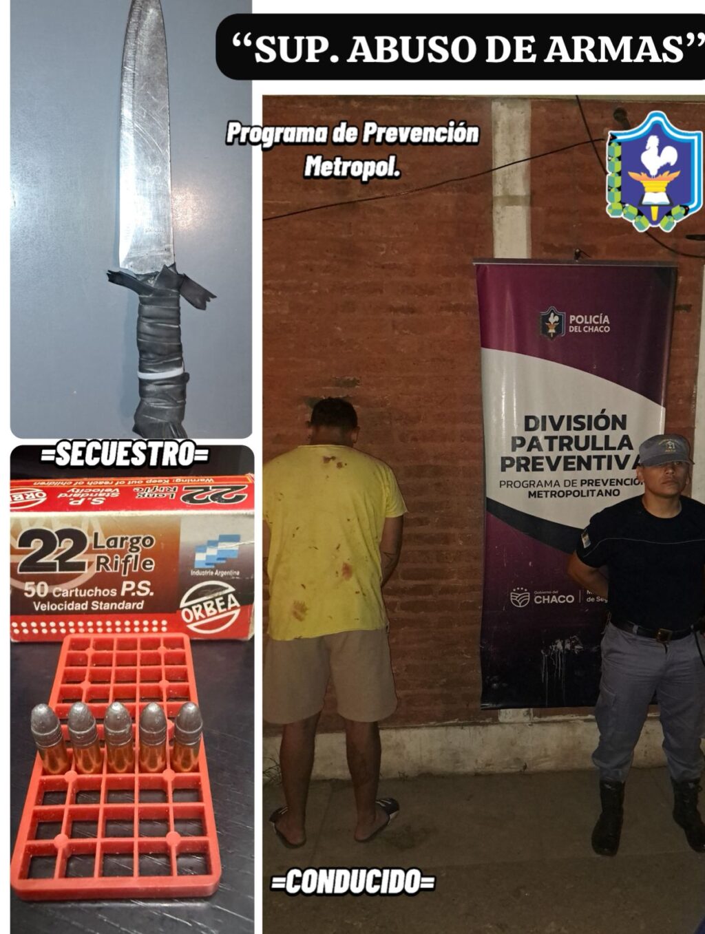Durante el procedimiento, los efectivos secuestraron cinco proyectiles calibre .22 con su respectiva caja y un cuchillo con empuñadura recubierta en goma negra que el sujeto tenía en su poder.