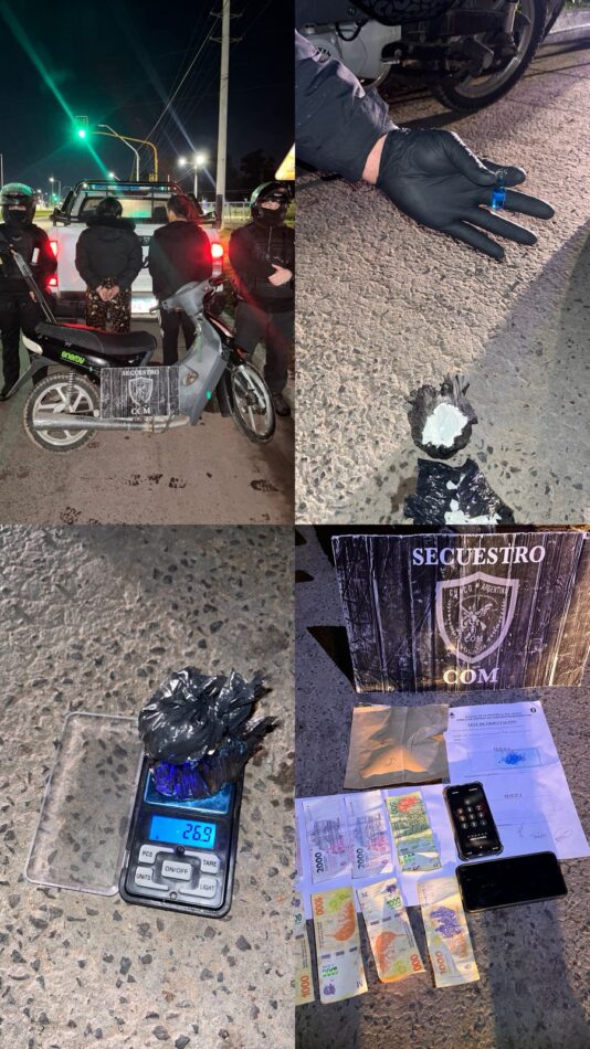 Esta madrugada, personal de la División C.O.M. demoró a dos jóvenes de 18 años que circulaban en una motocicleta y transportaban envoltorios con cocaína.