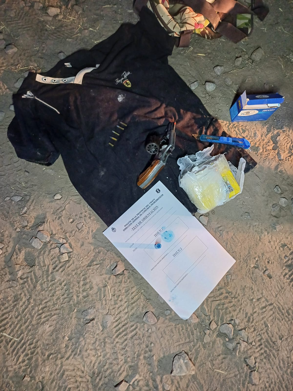 Con la presencia de distintas divisiones, Patrulla Preventiva, División Lince, Comisaría Sexta, Undécima y Decimocuarta se inspeccionó el bolso abandonado. En su interior se encontró 513 gramos de cocaína de máxima pureza, envuelta en cinta de embalar amarilla, un revólver calibre 22, con cartuchos y una vaina servida.