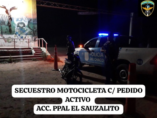 DIV. PATRULLA VIAL J.J.CASTELLI: Procedió secuestro (01) motocicleta HONDA WAVE 110 C.C. NEGRA Y AZUL SIN DOMINIO, el cual presentaba Pedido Activo Secuestro a solicitud Cria. Miraflores; Conductor ANRIQUEZ ELEODORO(criollo) 23 años, jornalero, DNI no recuerda, fue notificado actuaciones en Libertad, c/intervención Fisc.Inv.M.N.Pompeya en tanto secuestro permanece esta Dependencia.