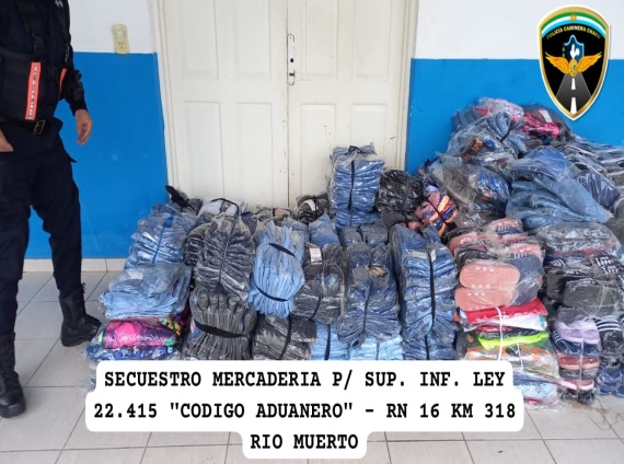 D.G.P.C.- PATRULLA VIAL CHARATA: hs 15:00 momento hallarse Rn 16 Km 318 – Rio Muerto, procedió SECUESTRO: (50) Bultos de PRENDAS VESTIR INFORMALES, (22) Bultos de ropas DEPORTIVAS (Adultos, niños) y (5) Bultos de CALZADOS (Ojotas, Crocs) estampados, el cual eran transportado en camioneta TOYOTA HILUX (AD-945-GU). conducida p/ DEIBIAGI CARLOS MAXIMILIANO (32), DDO. CIUDAD DE FONATANA. Se dió intervención Secretario Juzgado Federal N° 2 de Saenz Peña Sr. Agustin Blanco, dispuso SECUESTRO DE LA MERCADERÍA Y NOTIFICACIÓN P/ SUP. INFRACCIÓN AL CÓDIGO ADUANERO – LEY N° 22.415.