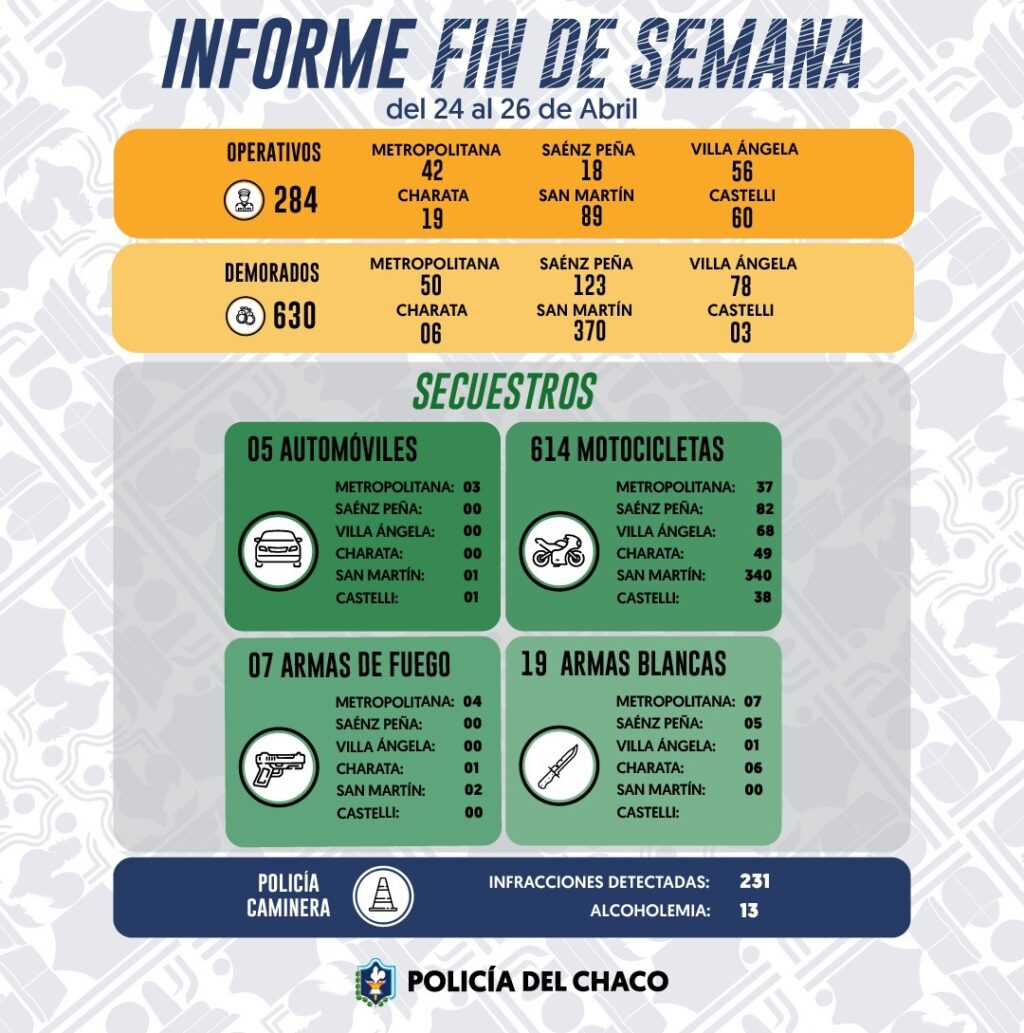 En el área Metropolitana, los agentes realizaron un total de 42 operativos en Resistencia y Gran Resistencia. En ellos aprehendieron a 32 personas por delitos y notificaron infracciones a 50 personas. También incautaron 37 motos, tres autos, cuatro armas de fuego y siete armas blancas.