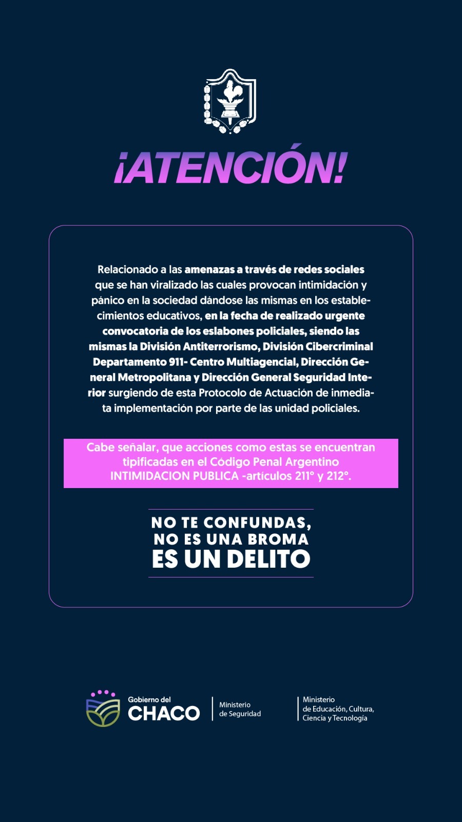Las autoridades fueron claras: las amenazas no son un juego. Este tipo de conductas está contemplado en el Código Penal Argentino como intimidación pública (artículos 211 y 212), lo que puede derivar en consecuencias penales para quienes las realicen.