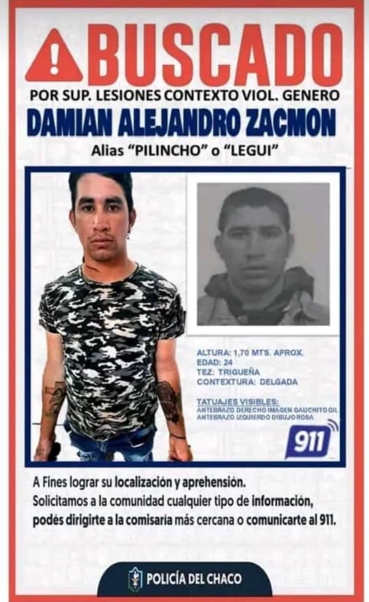 Damián Alejandro Zacmon, alias «pilincho» es buscado intensamente por la Policía del Chaco luego de golpear salvajemente a su ex pareja y madre de su hijo. La mujer agredida tiene 35 años y se supo que es una paciente de salud mental.