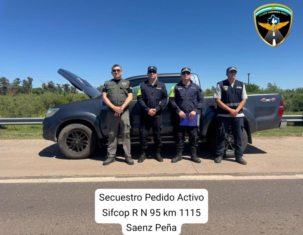 Durante un control de rutina realizado este mediodía sobre la Ruta Nacional N° 95, a la altura del kilómetro 1115, agentes de la División Patrulla Vial Sáenz Peña detectaron una camioneta Toyota Hilux que presentaba pedido de secuestro vigente.