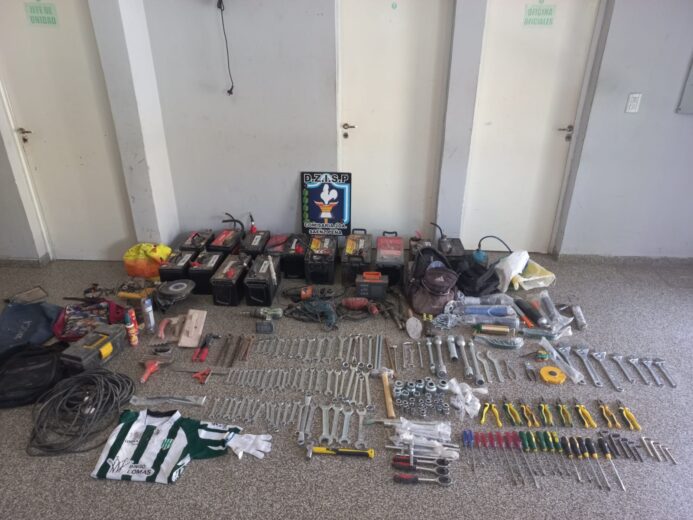 Entre los objetos recuperados se encuentran baterías, llaves, taladro, garrafa, caja de herramientas, destornilladores y llaves de distintas medidas, algunos de los cuales podrían estar relacionados con otros robos ocurridos en la zona.