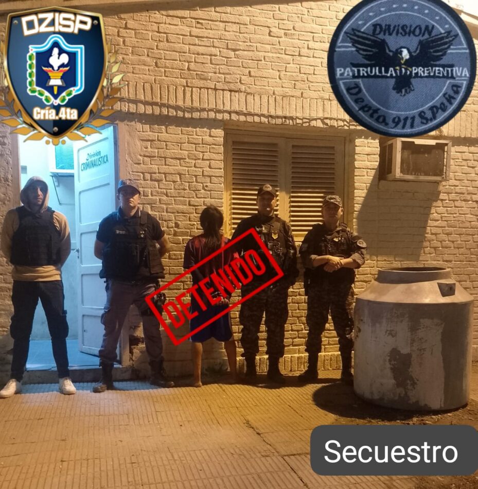 Al llegar al lugar, los agentes procedieron a la aprehensión de dos jóvenes, uno de 19 años y un menor de 16. En su poder se secuestró una motocicleta 110 cilindradas, una computadora portátil marca Banghó, y un palo de escoba de aproximadamente 1,5 metros.