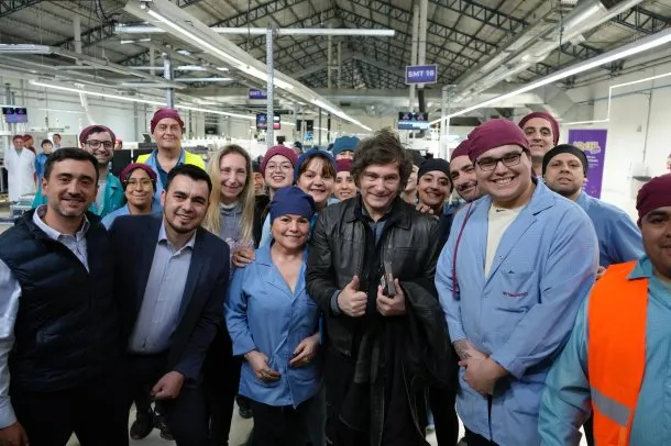 Javier Milei con trabajadores de una fábrica en Tierra del Fuego.