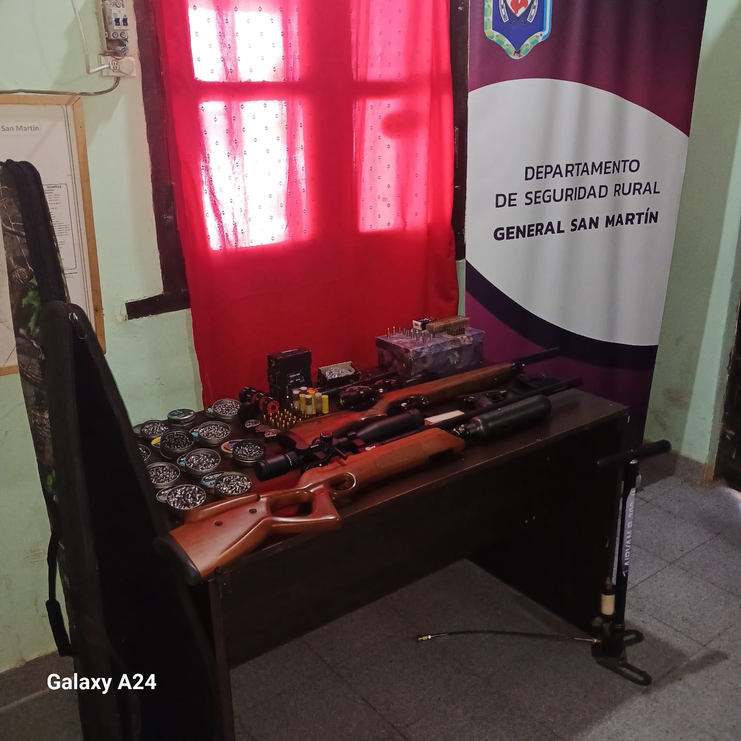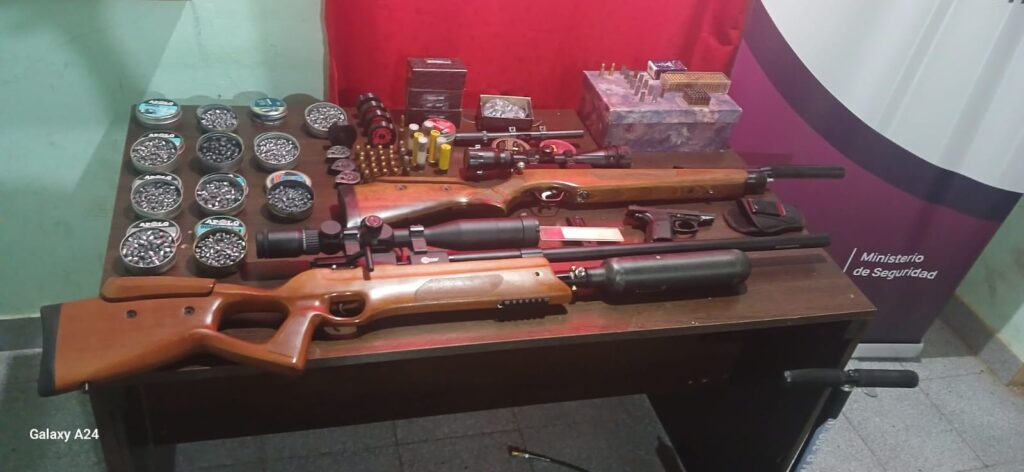 En el lugar se hallaron municiones de distintos calibres, una pistola Bersa Thunder 22 con cargador y funda, miras telescópicas, inflador para rifles y dos rifles de aire comprimido con sus respectivas miras, elementos que fueron secuestrados.