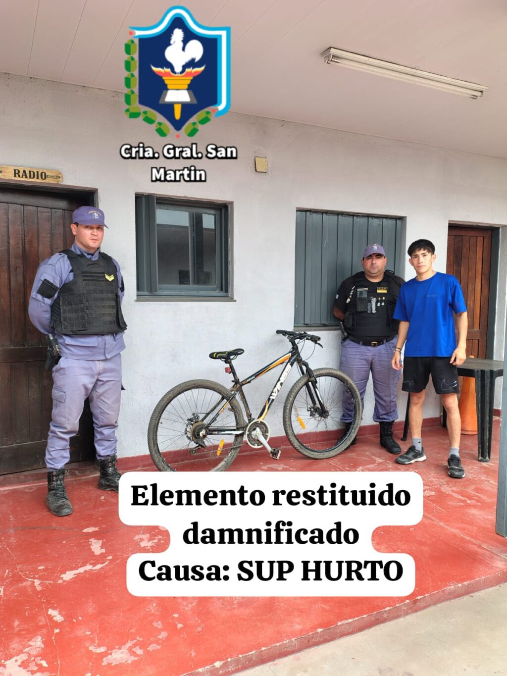 Este mediodía, efectivos de la Comisaría de General San Martín lograron recuperar una bicicleta que había sido denunciada como robada el día anterior, luego de que vecinos alertaron sobre un hombre que intentaba venderla en el barrio San Ceferino.