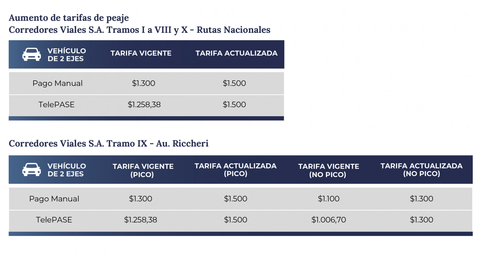 Las nuevas tarifas alcanzan a las estaciones de peaje emplazadas en los tramos del I al X de Corredores Viales S.A., entre los cuales se encuentra la autopista Riccheri, Ezeiza-Cañuelas, Buenos Aires – Rosario y Rosario – Córdoba, incluyendo distintos tramos de las rutas 3, 205, 5, 7, 8, 9 y 12, entre otras.