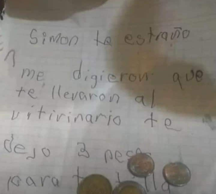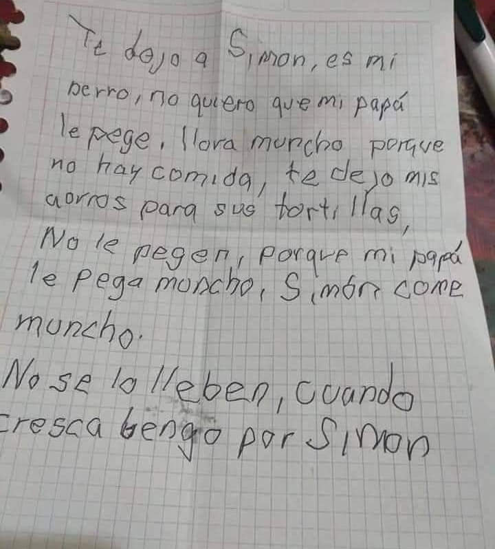 «Te dejo a Simón, es mi perro. No quiero que mi papá le pegue: llora mucho porque no hay comida. Te dejo mis ahorros para sus tortillas. Simón come mucho”, escribió el niño.