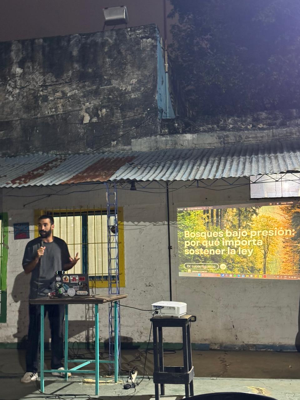 La actividad contó con la participación de Lucas Figueroa, investigador posdoctoral del CONICET, junto a jóvenes, ambientalistas y miembros de la comunidad interesados en la defensa de los bosques nativos y las políticas ambientales en la región.