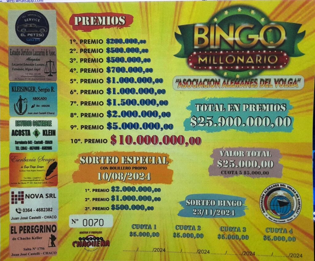 Se viene el gran Bingo de la Asociación Alemanes del Volga de Juan José CASTELLI, el único evento en la región a Parámetro exacto (participas sin estar presente), con un premio en total de 25.900.000 de pesos, en 10 importantes premios finales y 3 premios por pago contado, el valor del cartón es de 25,000 pesos, podes adquirirlo en la ASOCIACION ALEMANES DEL VOLGA, Pórtico FM 105.5 y con todos los vendedores autorizados.-