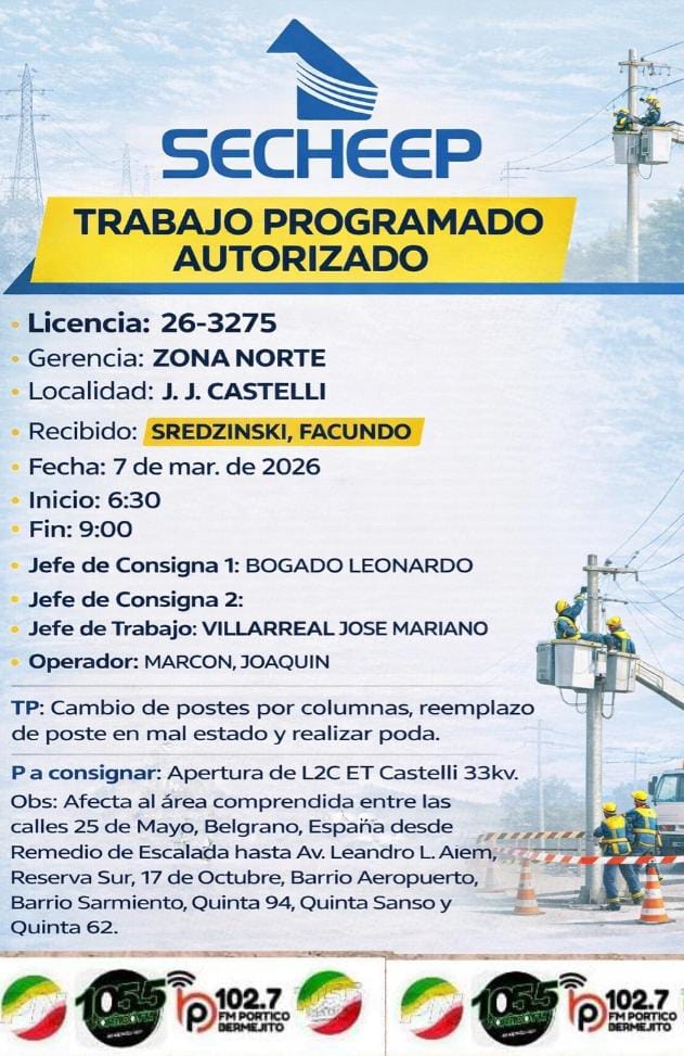 La empresa SECHEEP, a través de la Gerencia Zona Norte, informa a la comunidad de Juan José Castelli que se realizará un trabajo programado en la red eléctrica, debidamente autorizado bajo Licencia Nº 26-3275.