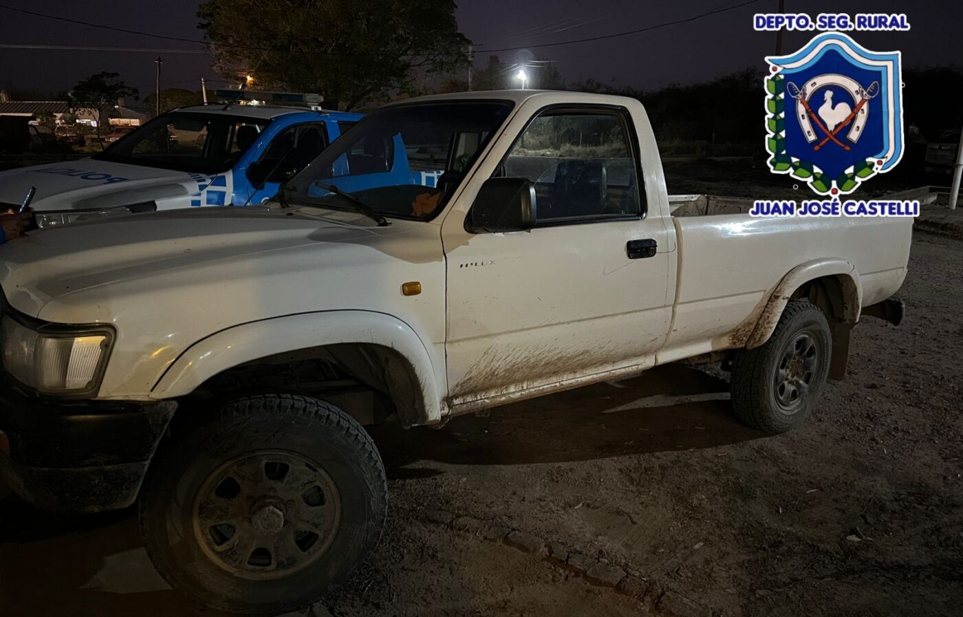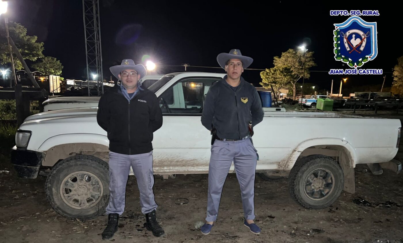 Los uniformados rurales momentos de estar llevando a cabo control vehicular en camino vecinal del Paraje Pampa Argentina – Castelli, interceptan el paso (01) Camioneta, marca Toyota, cabina simple, color blanco, dominio colocado, guiado por S. D., 36 años, acompañado de M. F., 49 años, solicitar documentaciones del rodado, conductor manifestó no poseer, momentos acompañante aduce que rodado pertenece al Ministerio de Educación Cultura Ciencia y Tecnología de la Provincia, que vehículo habían obtenido hace tres años aproximadamente mediante una cooperativa comunitaria, no contando con ningún tipo documentación al momento del control.