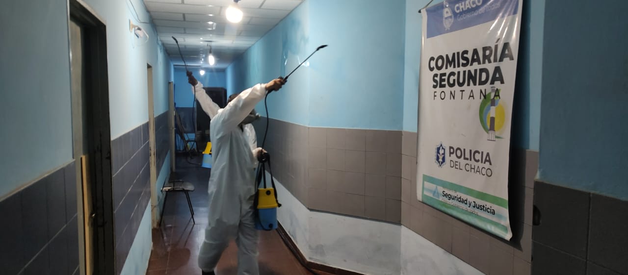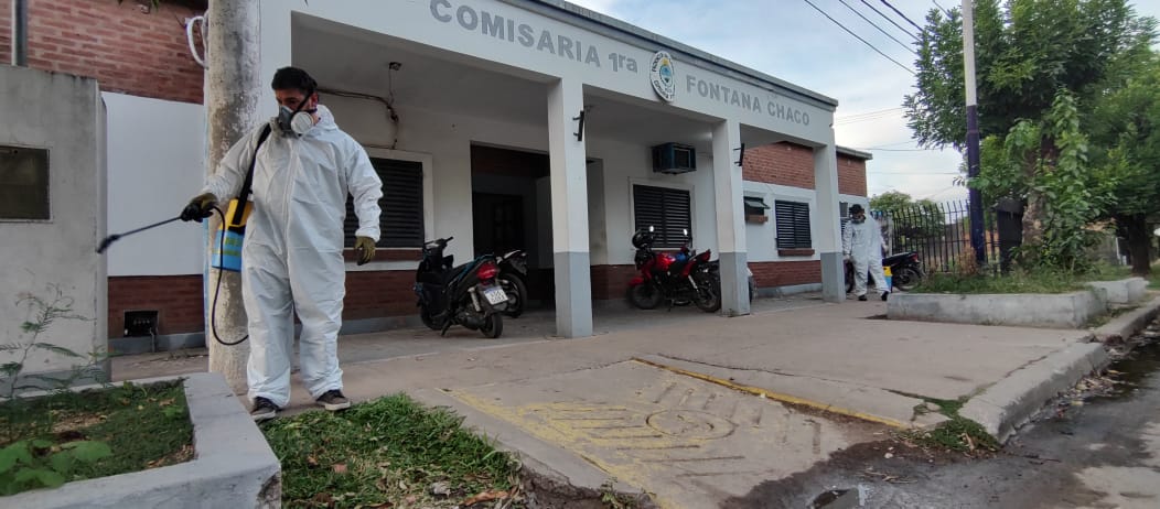 Esta vez la fumigación fue en los diferentes sectores de la Comisaría Primera y Segunda de Fontana, como el estacionamiento, el sector de secuestros, el frente, el patio interno, las oficinas, la guardia y demás.