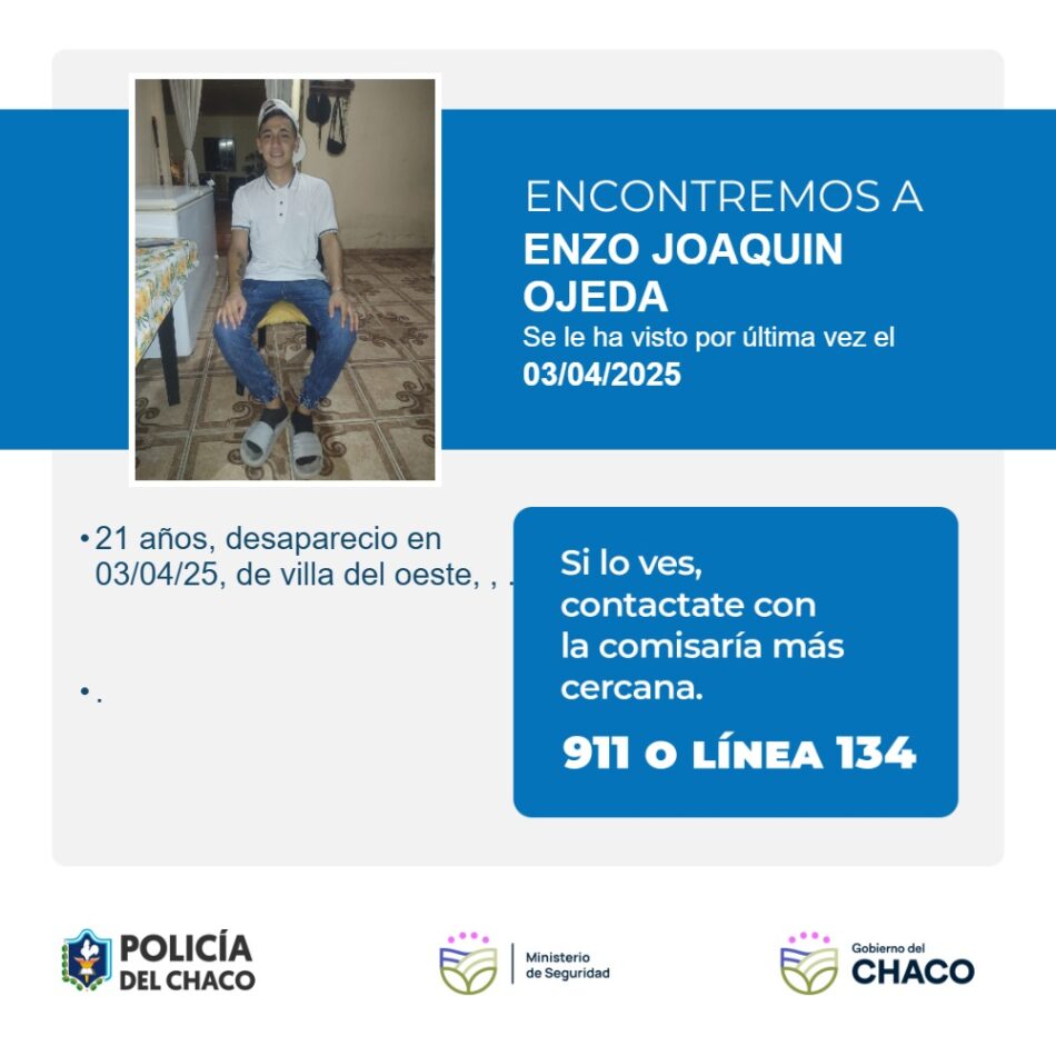 La Policía del Chaco en base a una denuncia registrada en Comisaria Cuarta, solicita a la comunidad su valiosa colaboración de informar a la unidad policial más cercana cualquier información relacionada al paradero de ENZO JOAQUIN OJEDA, de 21 años, de 1,70 metros de altura, de contextura física delgada, tez trigueña, cabello , ojos color Se le ha visto por última vez en Villa Del Oeste en fecha 03/04/2025.