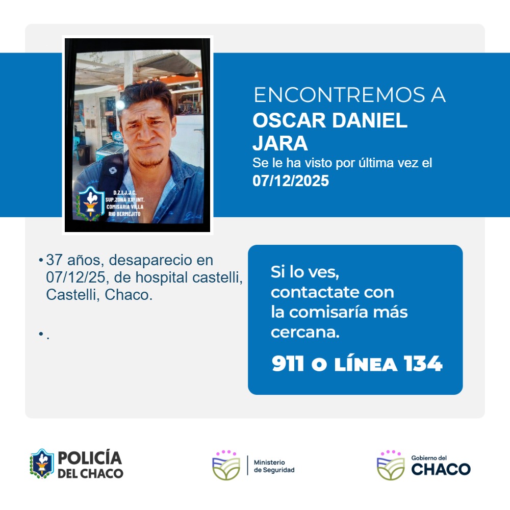 La Policía del Chaco en base a una denuncia registrada en Cria Villa Rio Bermejito, solicita a la comunidad su valiosa colaboración de informar a la unidad policial más cercana cualquier información relacionada al paradero de OSCAR DANIEL JARA, de 37 años de 1,80 metros de altura, de contextura física delgada, tez morocho, cabello semilargo negro , ojos color marrones Se le ha visto por última vez en Hospital Castelli en fecha 07/12/2025.
