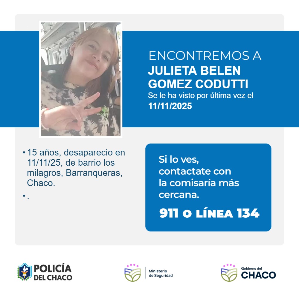 La Policía del Chaco en base a una denuncia registrada en Comisaria Decimocuarta, solicita a la comunidad su valiosa colaboración de informar a la unidad policial más cercana cualquier información relacionada al paradero de la persona menor JULIETA BELEN GOMEZ CODUTTI, de 15 años, de 1,57 metros de altura, de contextura física delgada, tez blanca, cabello lacio castaño oscuro con mechones rubios, ojos color verdes. Se le ha visto por última vez en Barrio Los Milagros en fecha 11/11/2025.