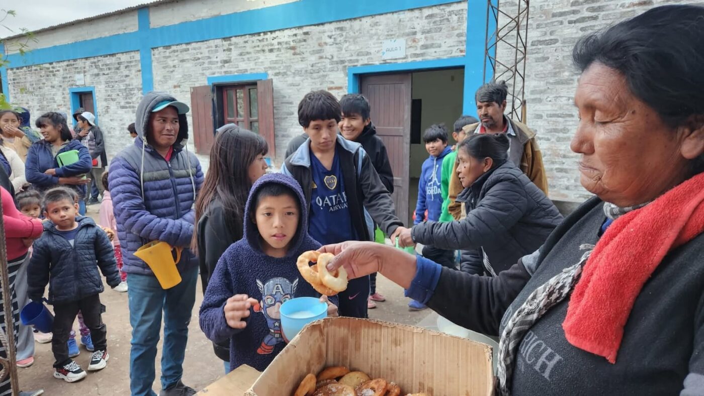 👍Allí, las madres del barrio se encargan con mucho esfuerzo y dedicación de preparar la merienda, que consiste en chocolate caliente acompañado de pan o rosquillas, generando un espacio de contención y alimentación para los más pequeños.