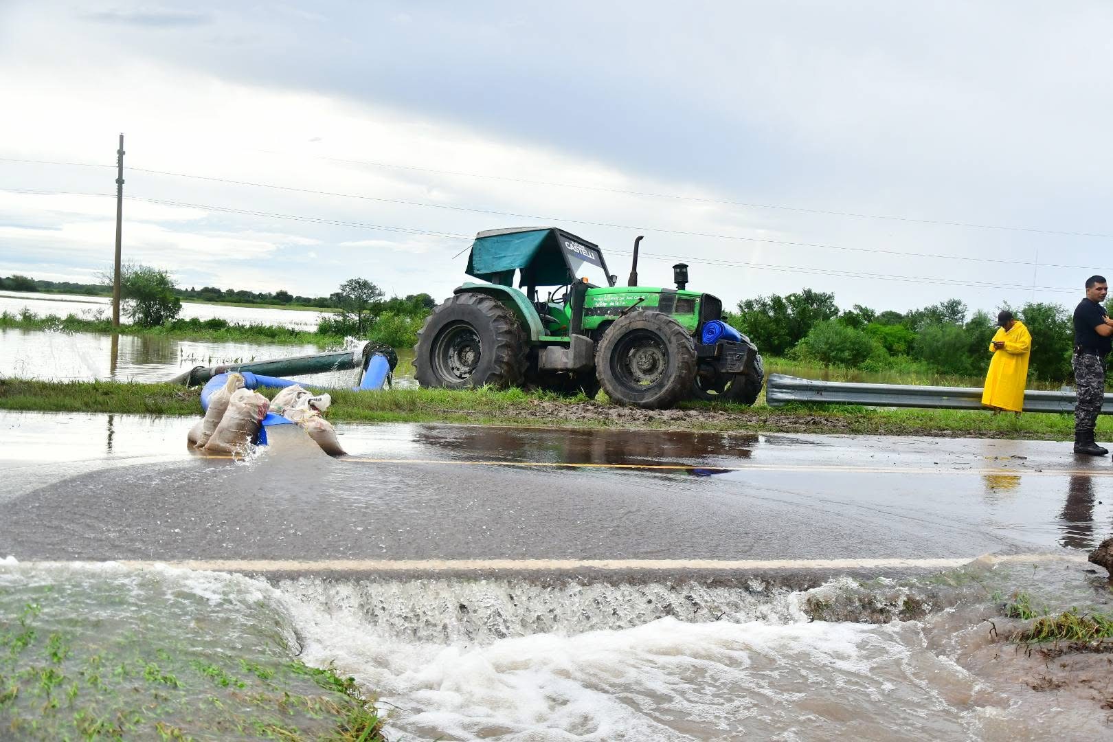 En esta oportunidad, se incorporaron dos nuevas bombas para ampliar la capacidad de evacuación de aguas pluviales, con intervención sobre Ruta 95, mediante el uso de retroexcavadora y bomba arrocera.