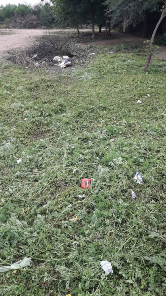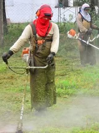 Un equipo de motoguadañistas recorre diariamente el barrio realizando tareas de control de maleza, especialmente en estos días de lluvia y lloviznas que favorecen su rápido crecimiento.