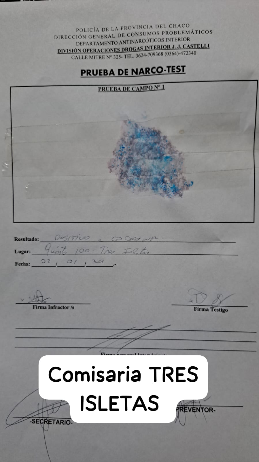 El operativo se realizo en la FECHA: 2/1/2024 desde las 20:00 horas, en AV. PRESIDENTE PERÓN Y DR. MOGLIA , PLAZA CENTRAL de la localidad de TRES ISLETAS. OPERATIVO de PREVENCIÓN y SEGURIDAD conforme Orden de Operaciones N° 003-DOI/2024, afectándose los RRHH de esta Unidad, División Investigaciones Juan José Castelli, Div. Tránsito Urbano y Patrulla Vial Juan José Castelli, Departamento Rural Juan José Castelli, División Operaciones Drogas Interior Juan José Castelli, con colaboración de personal de Tránsito Municipal.