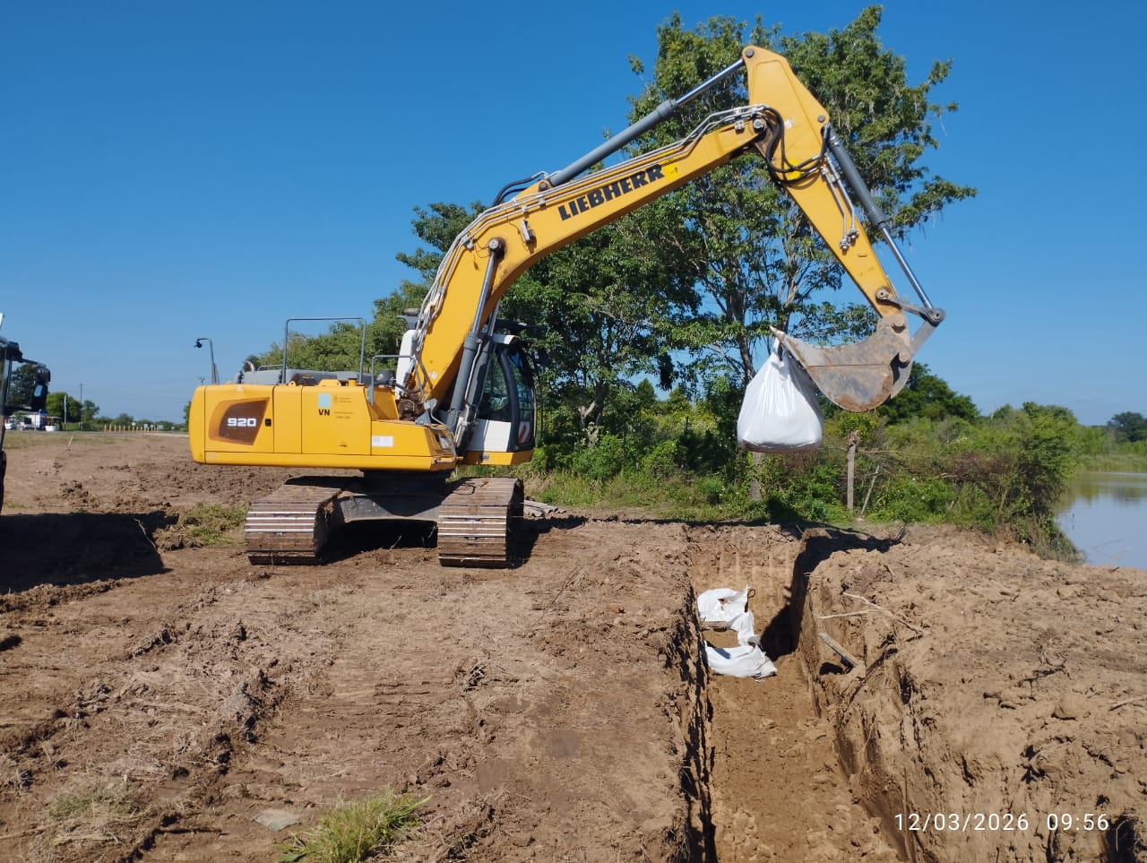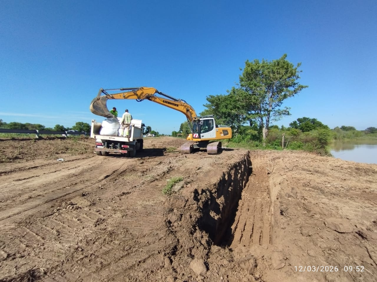 Las tareas comprenden la colocación de big bags (contenedores flexibles) rellenos con suelo, a fin de reforzar la estabilidad del sector ante las condiciones hidrológicas del río, junto con trabajos de limpieza y desmonte en zona de camino.