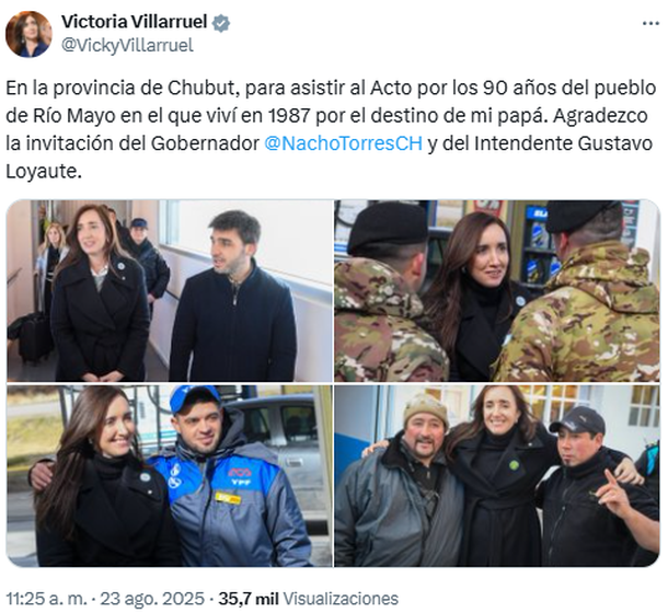 La mismísima vicepresidenta compartió en sus redes sociales el motivo de su paso por la provincia de Chubut: «En la provincia de Chubut, para asistir al Acto por los 90 años del pueblo de Río Mayo en el que viví en 1987 por el destino de mi papá. Agradezco la invitación del Gobernador @NachoTorresCH y del Intendente Gustavo Loyaute».