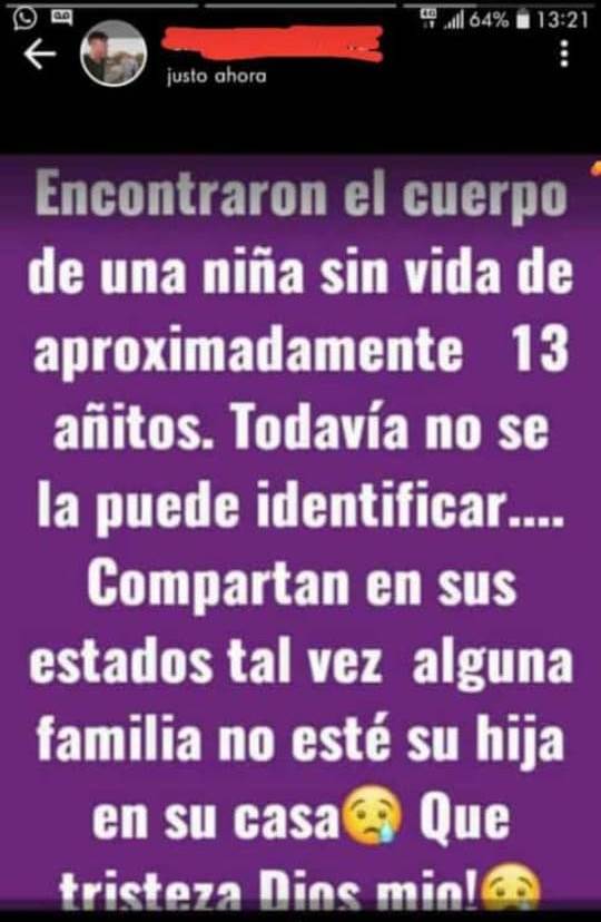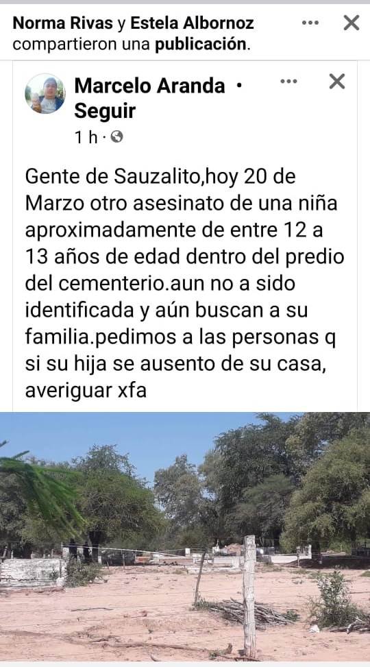 Tal como informábamos en nuestro adelanto, En la mañana de hoy domingo, encontraron MUERTA a una NIÑA de 16 años sin vida en la localidad EL SAUZALITO en pleno corazón del IMPENETRABLE, la niña es WICHI y fue encontrada en la jurisdicción del Cementerio local, la encontraron semidesnuda, con signos de golpes, extraoficialmente con signos de abuso.-